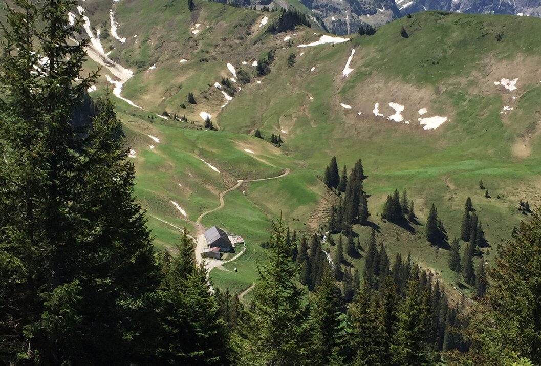 Nach der herrlichen Aussicht und einer kurzen Rast, wandern wir noch einige Meter auf der Rückseite des Gipfels weiter bis zur Abzweigung zur Usseralpe. Hier folgen wir Weg bis zur Hütte und bleiben nach einer eventuellen Einkehr auf dem Fahrweg und folgen diesem bis zum Ausgangspunkt nach Schmieden
