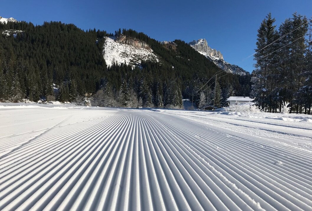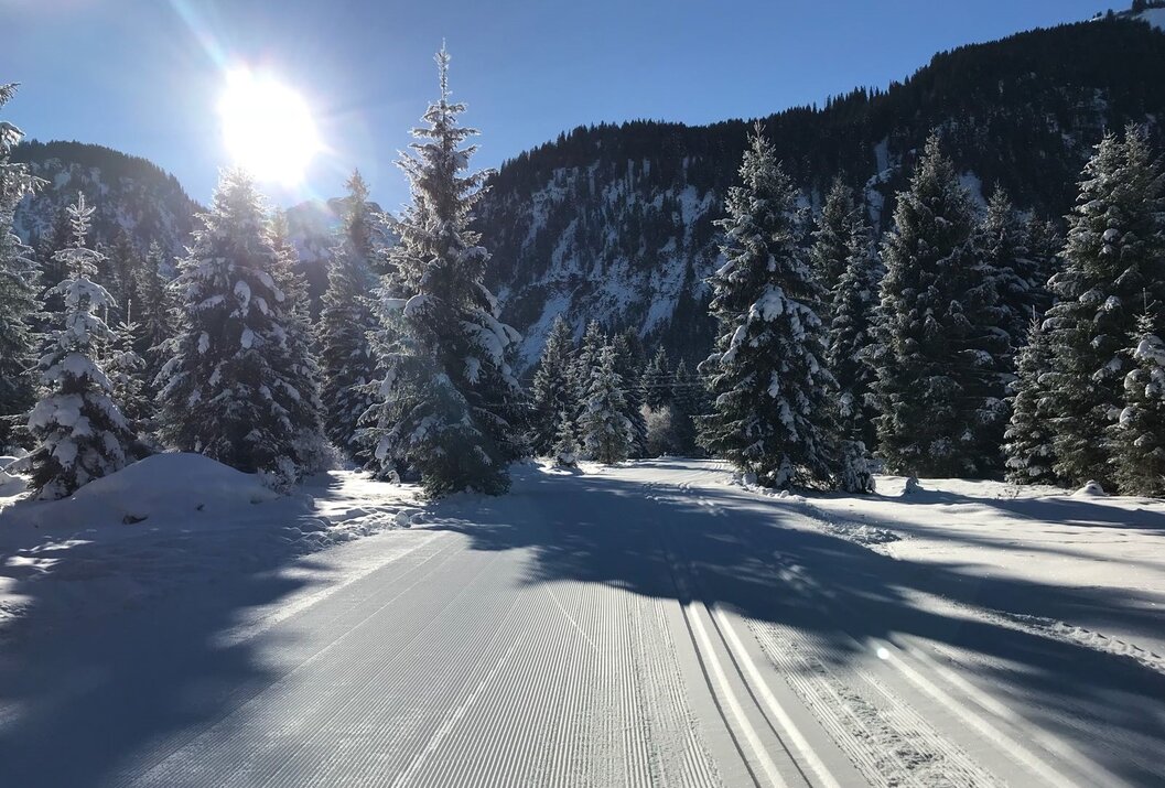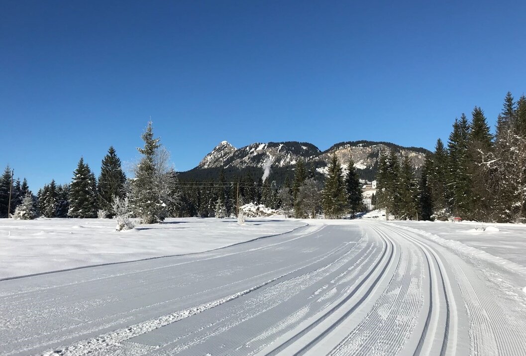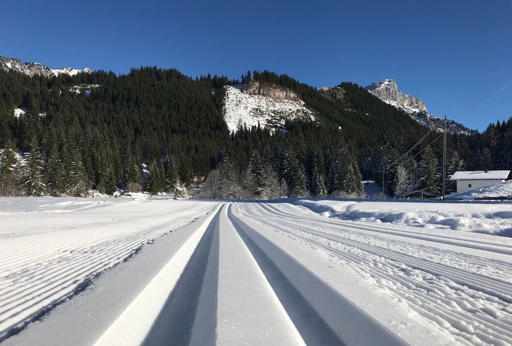 Auf der beschneiten Loipe im Tannheimer Tal ist auf der ca. 1,5 km langen Rundstrecke das Langlaufen für Skating und Klassisch auf einer bestens präparierten Loipe garantiert.