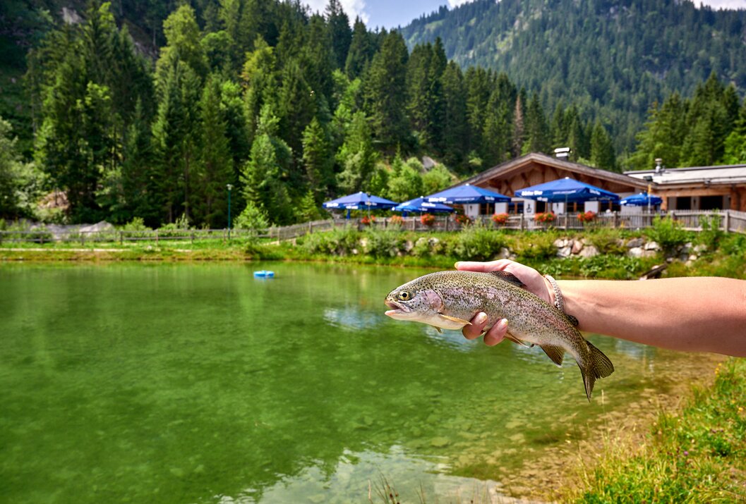 Angelteich ca. 2000m² groß für Kinder und Erwachsene, direkt am Wander- und Radweg, keine Landesabgabe erforderlich. Tauscher's Alm mit großer Sonnenterrasse, sowie frisch geräucherte Forellen.