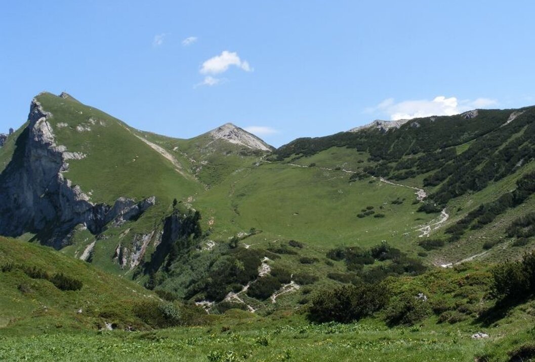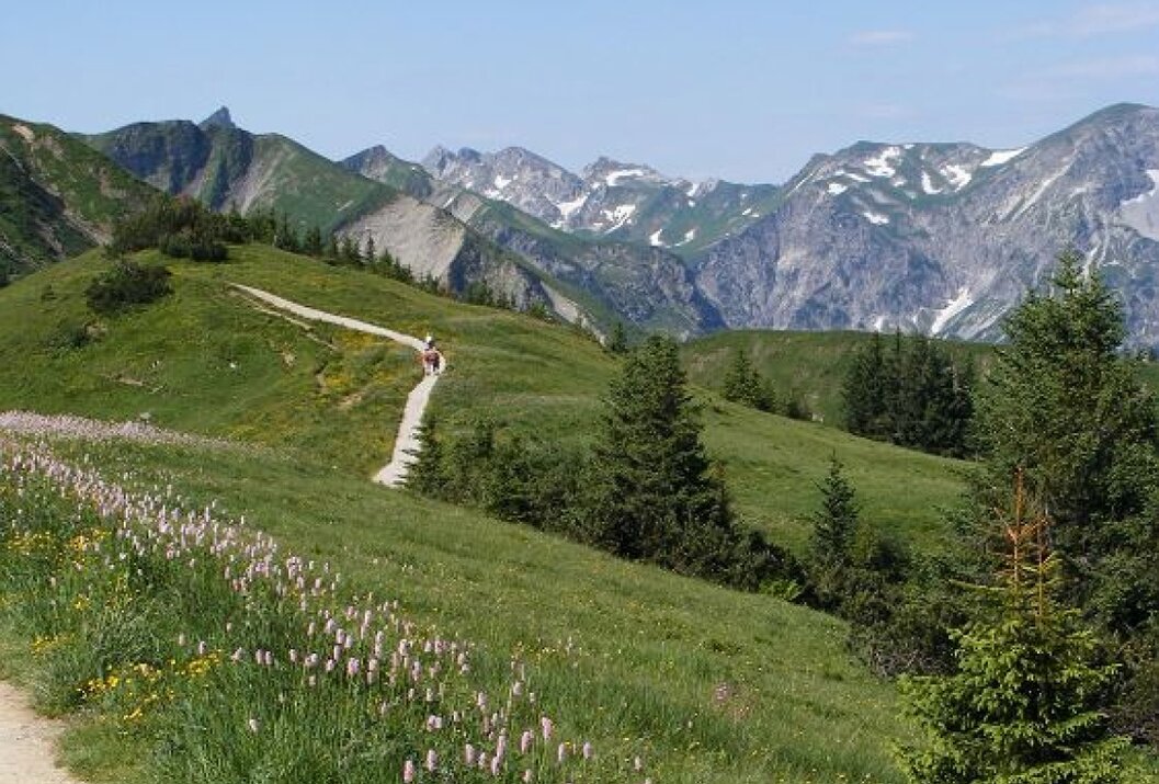 Vom Neunerköpfle führt ein wunderschöner Höhenweg oberhalb des Tannheimer Tals am Schrofen vorbei zur Landsberger Hütte.