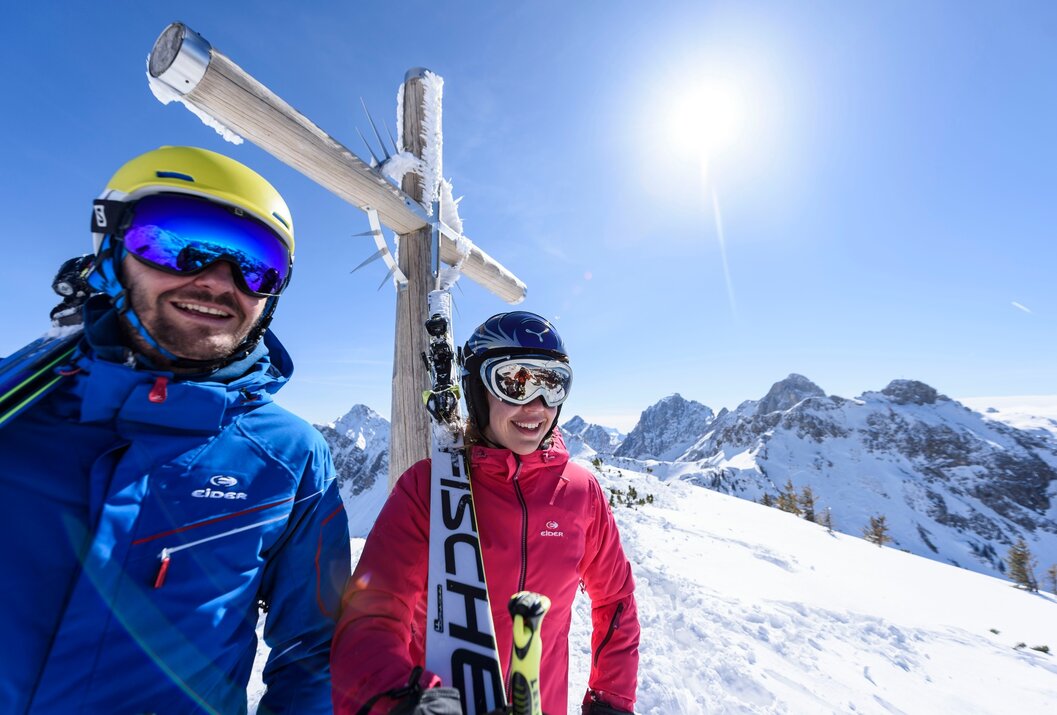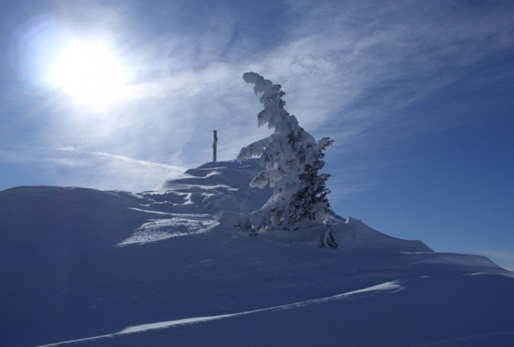 Dem Weg weiter folgend erreicht man in wenigen Minuten den Gipfel des Gamskopfes. An klaren TAgen warten dort oben ein sagenhaftes Bergpanorama und eine Fernsicht, wie man sie sonst nur selten erlebt - bis ins 100 km entfernte München reicht der Blick. Wer genau wissen möchte, welche Berge rundum zu bewundern sind: ein Panoramablick-Informator sorgt für den nötigen Überblick. Auch im Winter ist der Weg zum Gamskopf präpariert und begehbar. Gehzeit ca 1 Stunde.