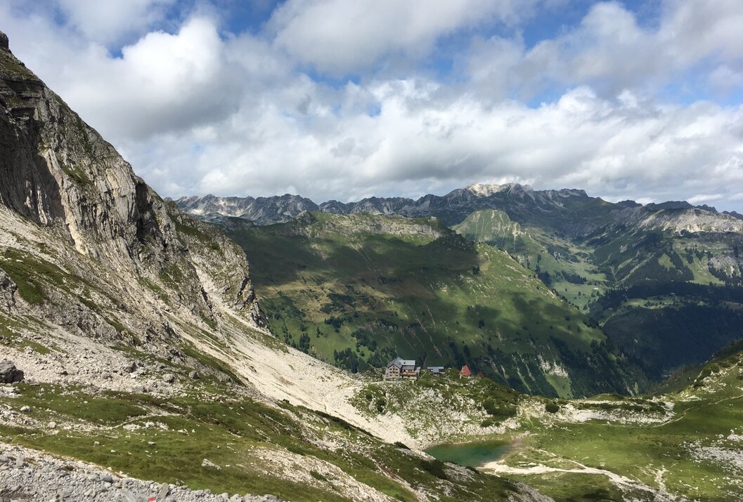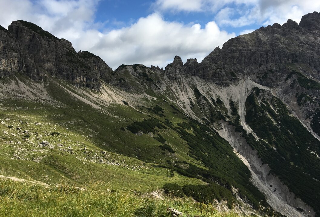 Wieder spielt der Hochvogel für uns heute eine zentrale Rolle. Von Hinterhornbach steigen wir auf jener Seite hinauf, auf der früher noch ein anspruchsvoller Steig direkt auf den Gipfel zog. Da der Berg sich jedoch in den letzten Jahren immer mehr spaltet und ein Bergsturz wahrscheinlich ist, kommt eine Begehung dieser Variante nicht mehr in Frage. Wir hingegen wandern zunächst etwas weniger anspruchsvoll über den Fuchsensattel auf die Nordseite des imposanten Felsriesen und halten uns in Richtung Prinz-Luitpold-Haus. Der Aufstieg unterhalb des Kalten Winkels bis über einen Felsrücken und hinüber zur Balkenscharte fordert unsere volle Konzentration, ehe wir unsere bereits bekannte Hütte erblicken. Heute jedoch markiert sie nicht unser Etappenziel – das erreichen wir erst rund zwei Stunden später unten im Tal am Giebelhaus. Von dort bringt uns ein Bus nach Hinterstein – dem Ziel unserer heutigen Etappe. Achtung: Der letzte Bus vom Giebelhaus nach Hinterstein fährt in den Sommermonaten kurz nach 18 Uhr - unbedingt die Zeit entsprechend einteilen!