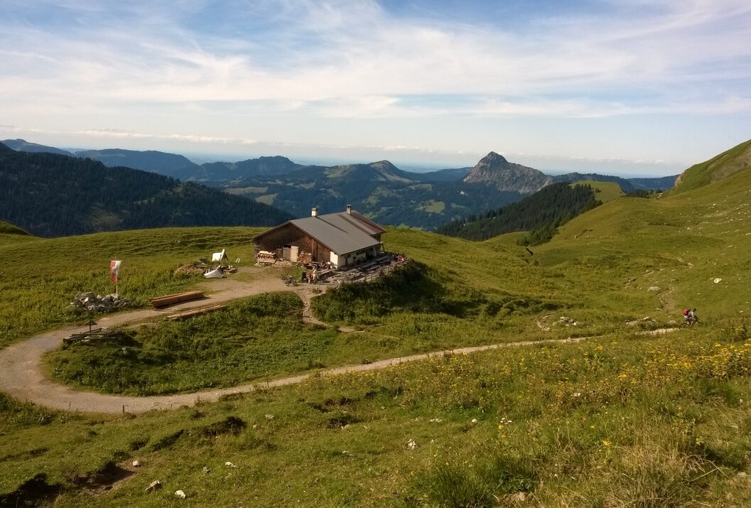 Wegbeschreibung:Mit der Gondelbahn zur Bergstation Neunerköpfle. Von dort Richtung Süden auf einem gut zu begehenden Bergpfad zur Oberen Strindenalpe. Weiter auf einem Fahrweg über die Strindenscharte zur Gappenfeld Alpe.