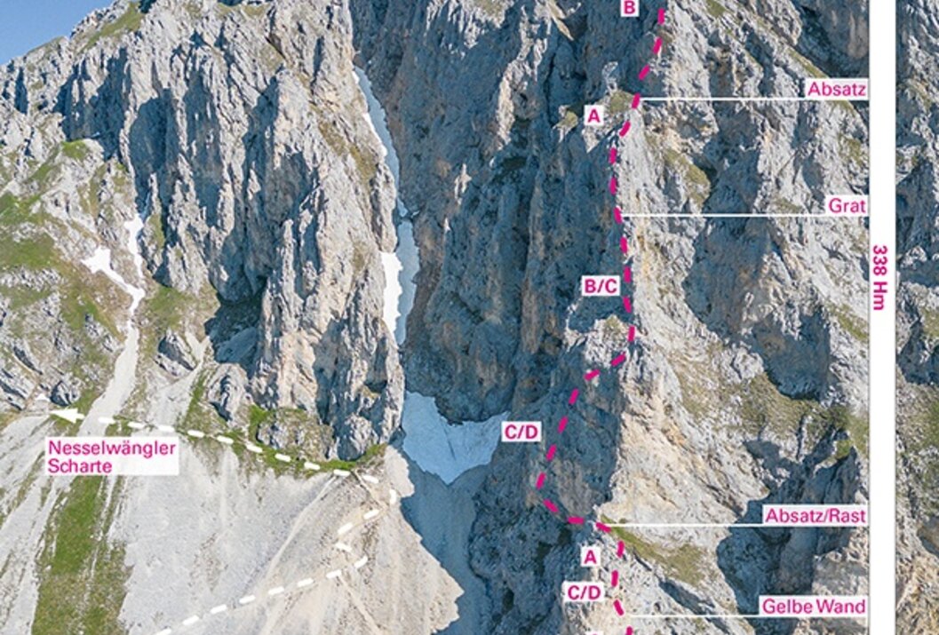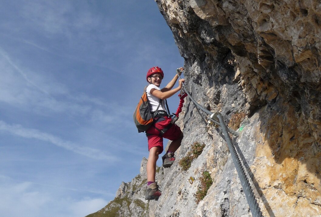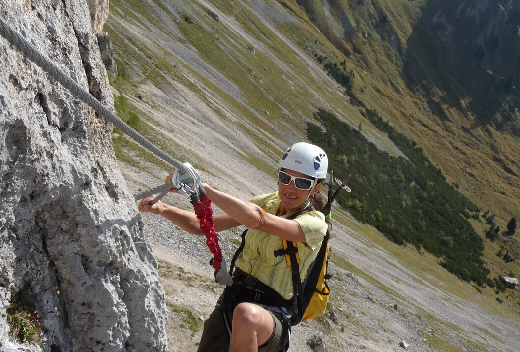Vollständige Klettersteig-Ausrüstung (Klettersteigset, Gurt und Helm) auch für Geübte unbedingt empfohlen!