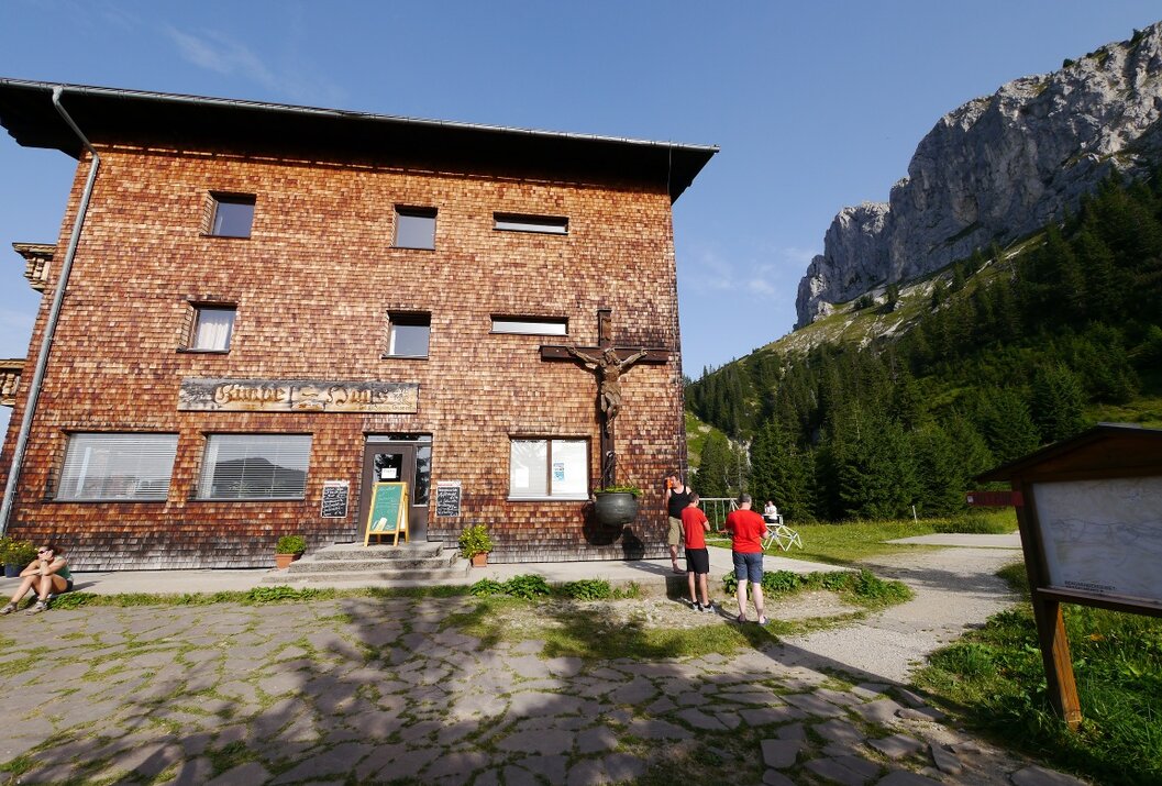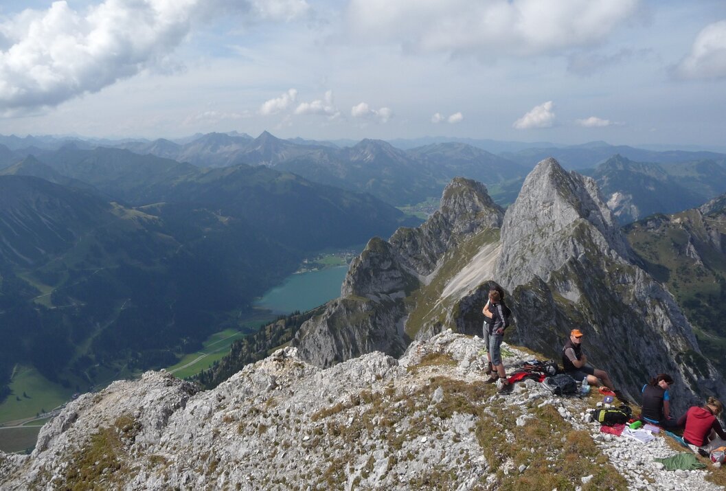 Vom Gipfel erfolgt der Abstieg über den markierten Normalweg (teils drahtseilgesichert, Stellen I–II) zurück zur Tannheimer Hütte. Von dort auf dem bekannten Zustiegsweg ins Tal. Gesamte Abstiegzeit ca. 2,5–3 Stunden.