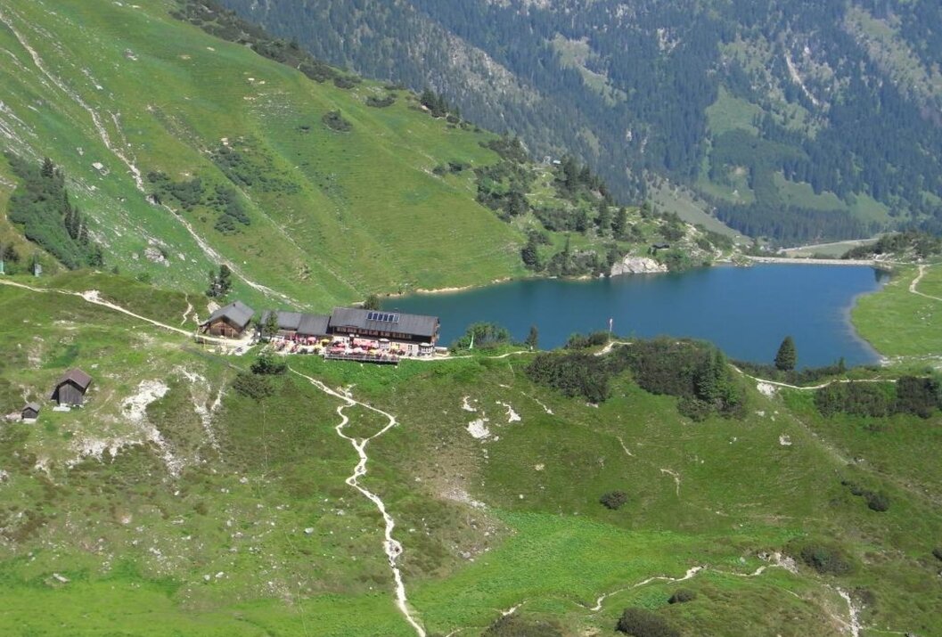 Vom Gipfel geht es entweder über den Normalweg (markierter Steig, Stellen bis I) zurück Richtung Lachesee und zur Landsberger Hütte oder als Rundtour weiter über die benachbarten Gipfel (z. B. Rote Spitze oder Steinkarspitze). Ab der Hütte dann zurück ins Tal zum Ausgangspunkt. Abstieg insgesamt ca. 3–3,5 Stunden.