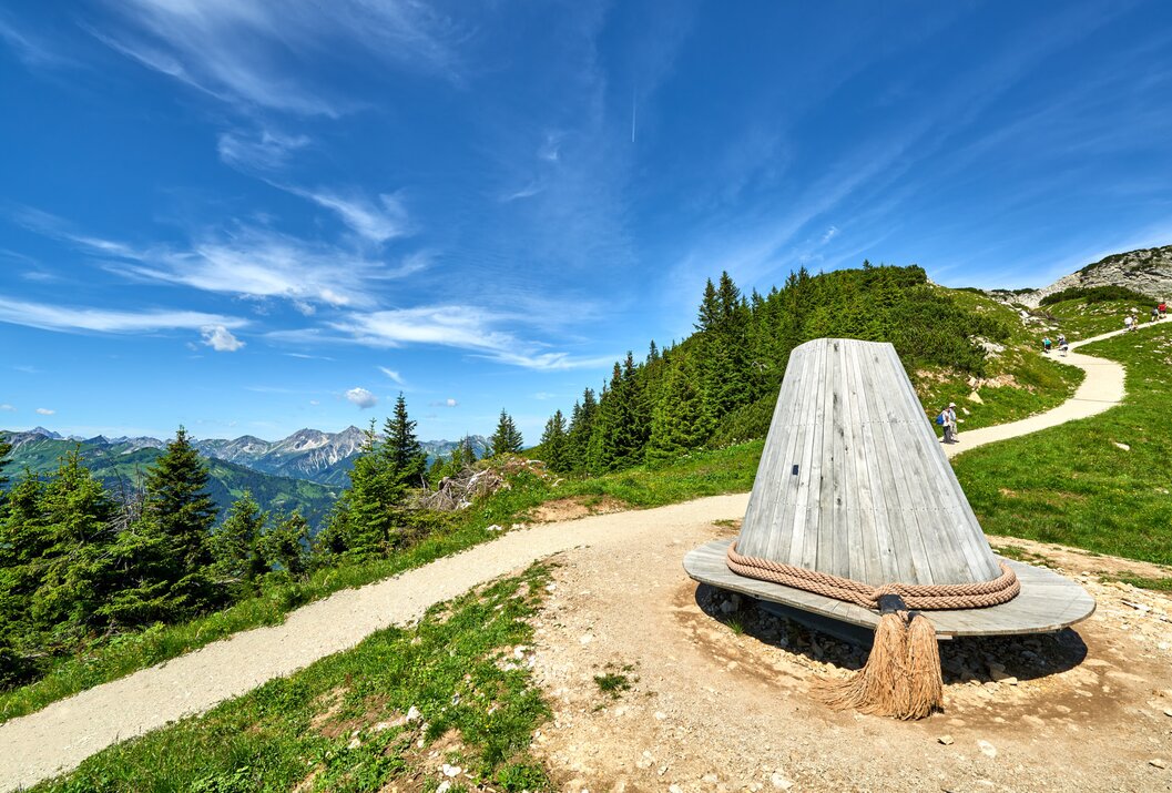 Der „Kuckst Du – Sonnenpanoramahut“ kann von der Bergstation Füssener Jöchle mühelos auf unserem Geo-Pfad in Richtung Gamskopf erreicht werden. Der Hut steht unseren Gästen Sommer wie auch Winter zur Verfügung!