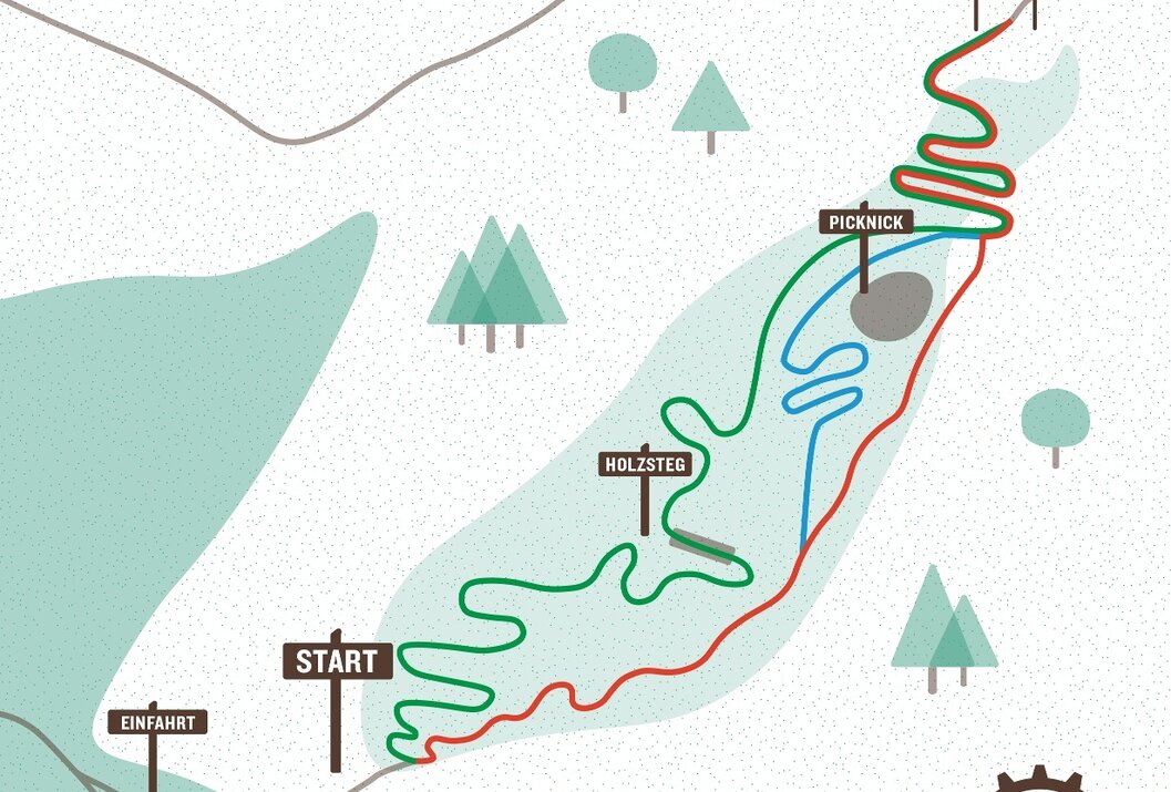 Die 3 Übungsstrecken von je 500m bieten verschiedene Abfahrten mit unterschiedlichen Ansprüchen: Die flowige PONTENLINE schlängelt sich mit zahlreichen Kurven und Wellen durch den Mühlwald. Die ZIRLESECKLINE und ROHNENELINE sind technisch anspruchsvoller mit Wurzeln und Absätzen. Alle 3 Trails starten am gleichen Ausgangspunkt und münden am Ende wieder zusammen. Somit können Einsteiger und Könner gemeinsam biken.