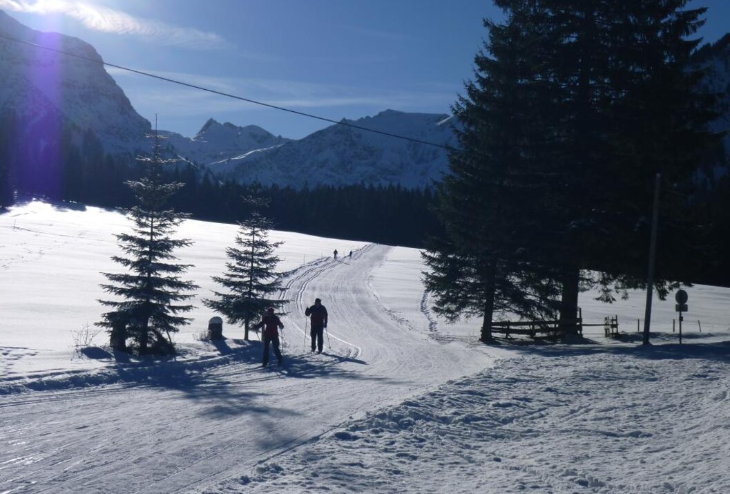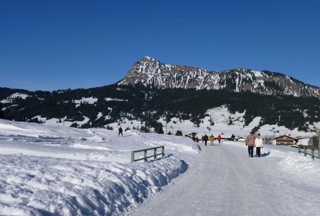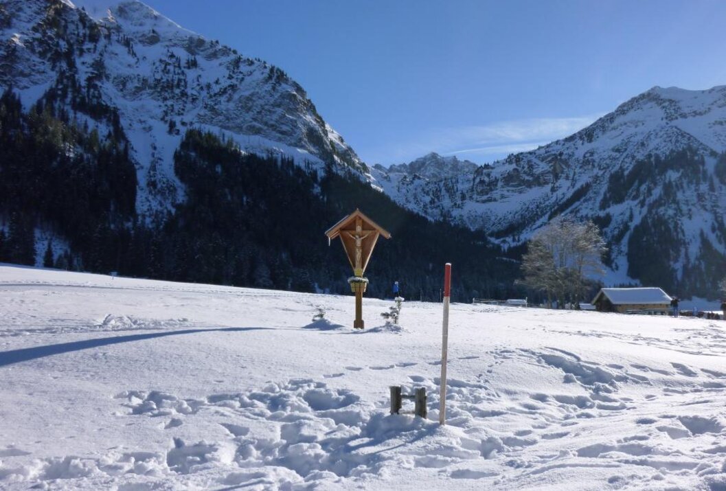 Vom Parkplatz P1 starten durch den Ort, vorbei an der Maria-Hilf Kapelle, 500 m nach der Schranke besteht die Möglichkeit rechts in den Waldweg abzubiegen. Dieser Weg wird nicht geräumt. Die Straße führt direkt an den Vilsalpsee