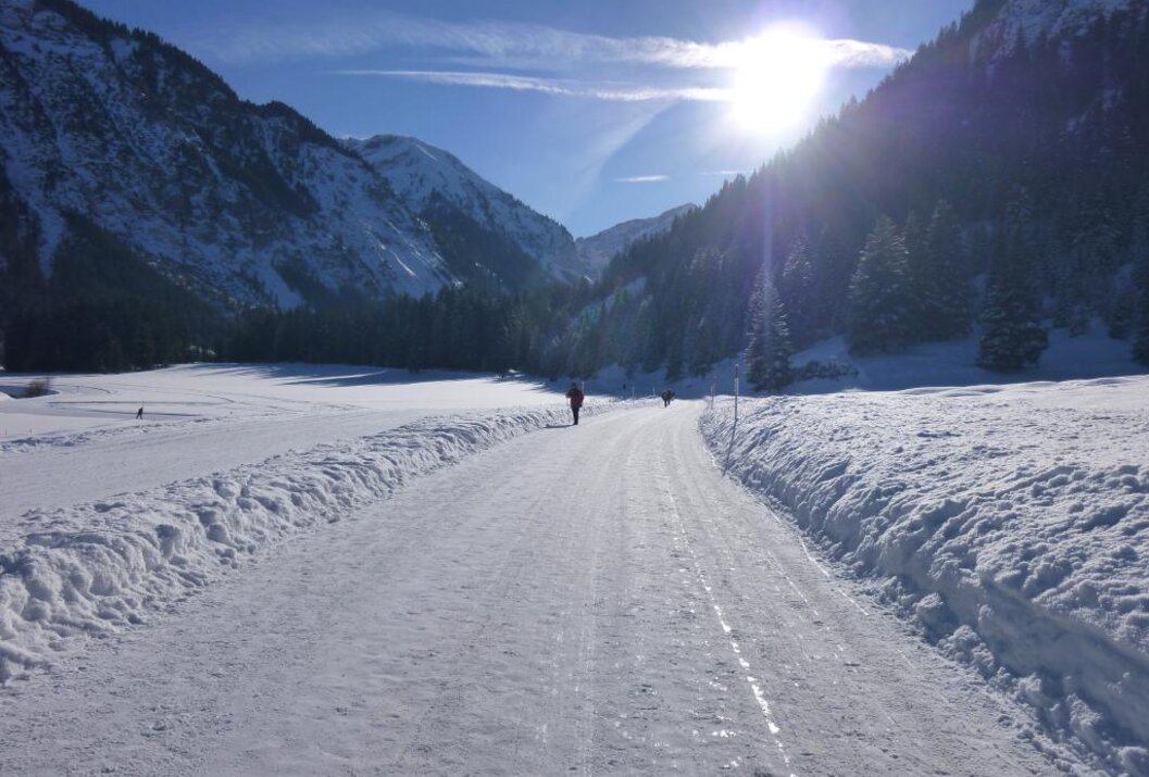 Von der Tourismusinformation in Tannheim Richtung Süden die geräumte Straße zum Vilsalpsee entlang.