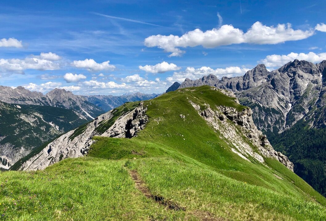 Diesen verlassen wir bereits nach einigen Minuten und steigen auf einem schmalen Pfad linker Hand steil nach oben. Der dichte Wald gibt ab und an den Blick auf den Hochvogel zu unserer Rechten frei. Der Wald wird lichter und geht in einen weiten Latschenhang Über. Immer noch steil steigt der Weg dem Kanzberg entgegen nach oben. Der Rücken ist durch und durch Gras bewachsen. An der Kanzberghütte, kurz vor dem Gipfel selbst, bietet sich eine Rast mit Panorama-Blick in die Lechtaler Berge an.