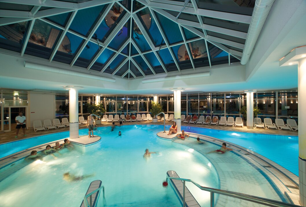An adventure pool with whirlpool loungers, adventure lighting and current canal, sports pool, warm water outdoor facility and bathing lake promise a varied stay.