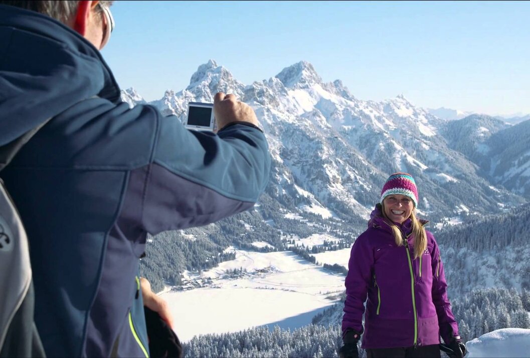 Directions:From the mountain station of the 8-person gondola Neunerköpfle in Tannheim, the path first leads a short stretch along the edge of the ski slope upwards. Then it continues to the right to the paragliders' launch site. An unforgettable experience to watch the pilots at takeoff. Now the path goes slightly downhill. Before us is an impressive winter landscape with the deeply snow-covered peaks of Geißhorn, Rauhorn, and Kugelhorn. Idyllically to the left below us lies the village of Tannheim. After a short climb, we reach a saddle. On the left, we see the Usseralpe and on the lower right the Strindenalpe. The turning point of the winter hiking trail is now reached. On the higher return path, we already see the summit of Neunerköpfle ahead. Just below the summit is also the largest summit register in the Alps, measuring 3 meters in height and 2 pages each 2.3 meters wide. Besides the overwhelming view over the entire valley and an almost limitless panorama, the summit cross with a wooden corpus is also particularly worth seeing. Alpine choughs above us and skiers on the slopes below let the heart beat a little faster. The descent to the mountain station proceeds along the flank of Neunerköpfle, partly with a railing on the valley side, and gives us another chance to see the Tannheimer Tal from above. Should hunger or thirst strike before the descent by gondola, there is also provision for refreshments at this altitude.